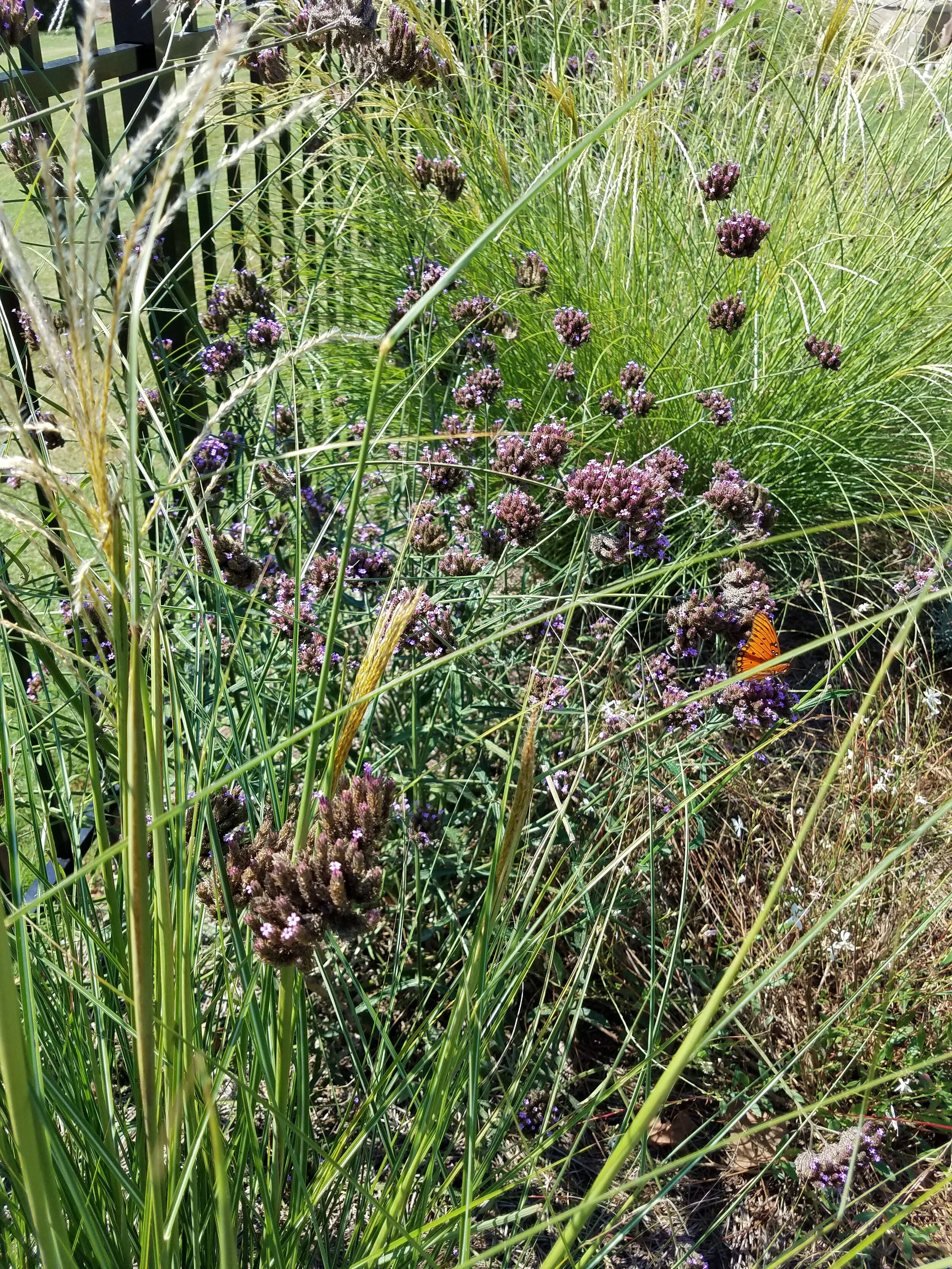 With an open-air habit, Verbena Bonariensis is ideal in the back of a landscape for color and height or left to it’s own devices as more of a focal planting. In either case, you will be astounded by it’s ability to invite bees, butterflies, moths and hummingbirds to sample it’s menu. We have seen skippers, swallowtails, monarchs and brushfoots as well as American Goldfinches which forage the flower clusters for seeds as they mature. In August and September, Gulf Fritillary butterflies amass in the dozens with Verbena one of their choice nectar plants.